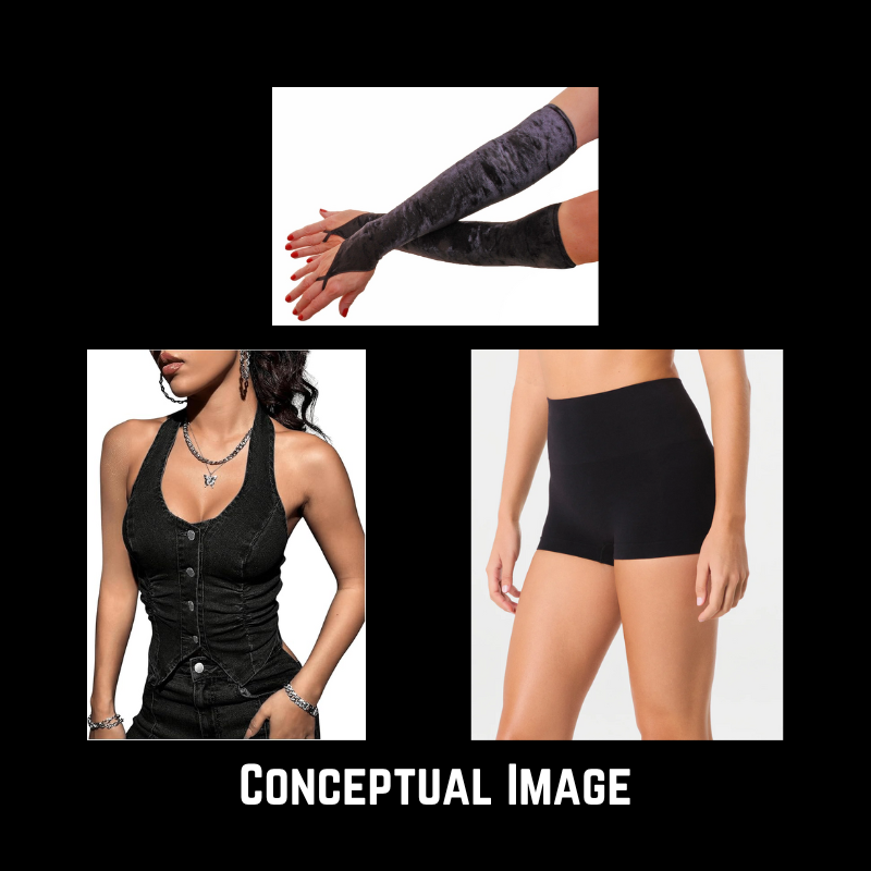 Includes: custom black velvet shorts, custom black velvet gauntlet-length gloves, denim top, and black rhinestones.